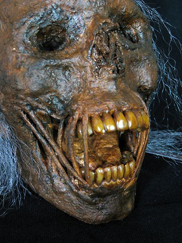 This corpse skull is hand fabricated on a medically accurate skull model. Has a leathery feel and has a close to accurate weight to it. Each one is a little different. Primary coating is latex.